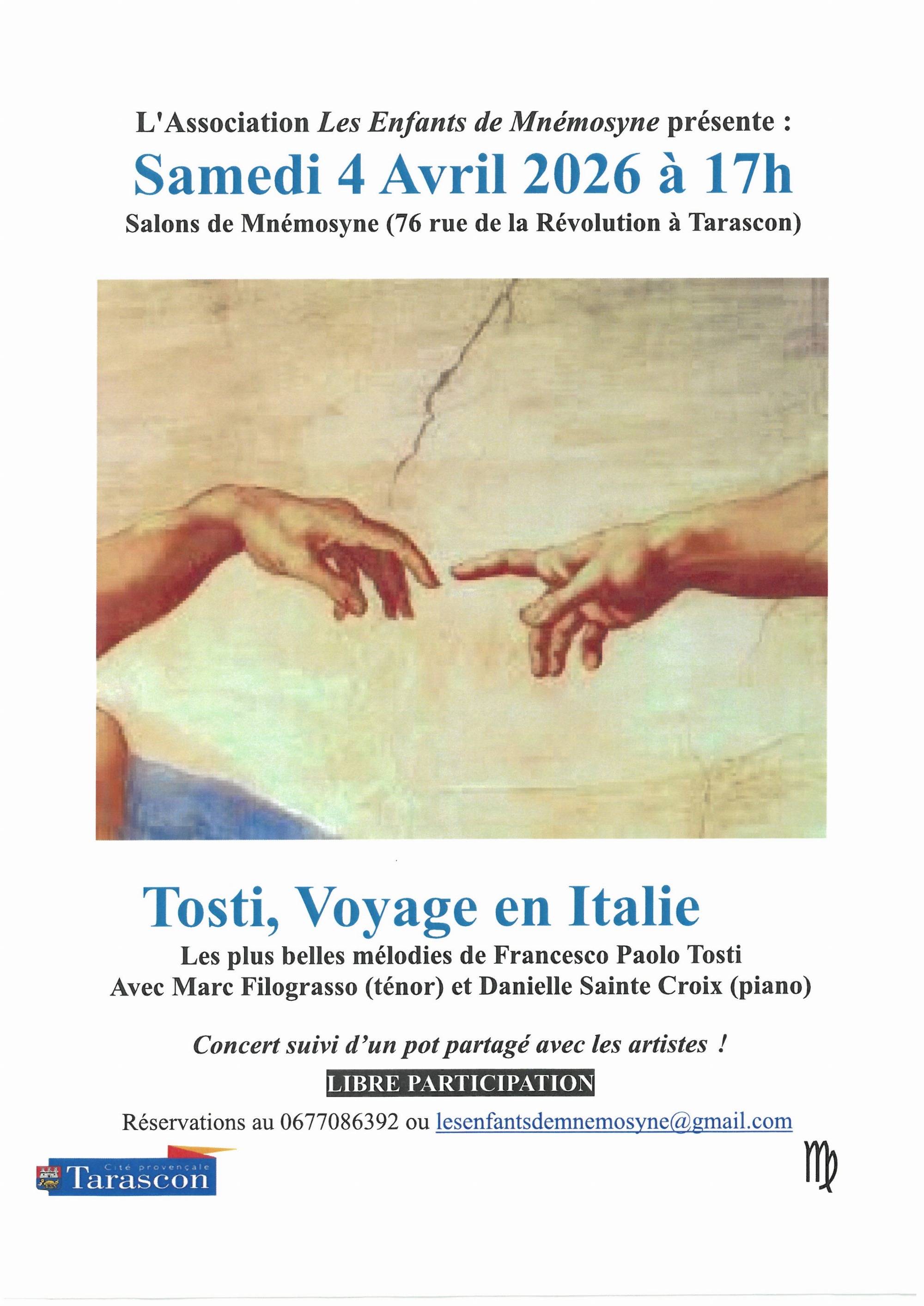 L'association Les Enfants de Mnémosyne vous invite dans ses salons pour profiter d'un concert avec les plus belles mélodies de Francesco Paolo Tosti avec Marc Filograsso (ténor) et Danielle Sainte-Croix (piano).