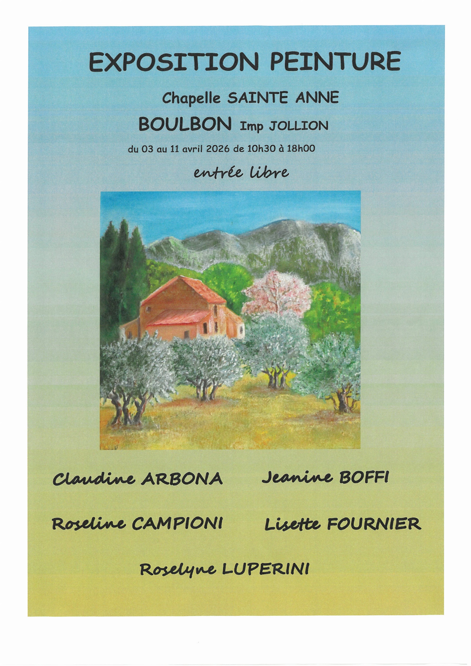 Installé au centre culturel Sainte-Anne, cette exposition met à l'honneur les peintures de Claudine Arbona, Jeanine Boffi, Roseline Campioni, Lisette Fournier et Roselyne Luperini.