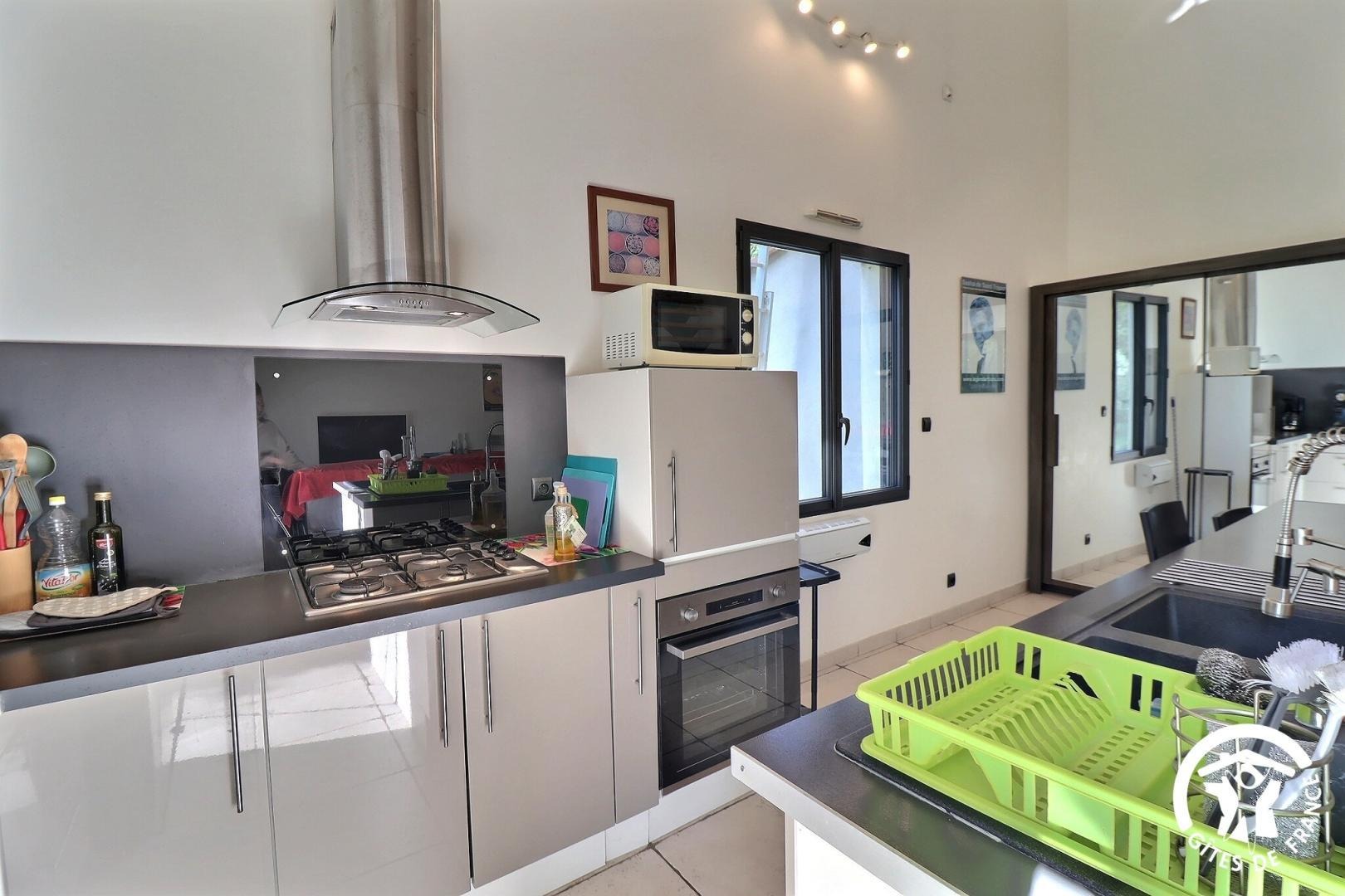 - Pièce de vie avec grande hauteur sous plafond : cuisine ouverte sur le séjour, équipée avec un grand îlot central avec espace repas 6 personnes, évier, réfrigérateur/congélateur, 4 feux gaz, hotte, four, micro-ondes, petit électroménager. Salon avec canapés, fauteuils, table basse, TV, grande armoire.