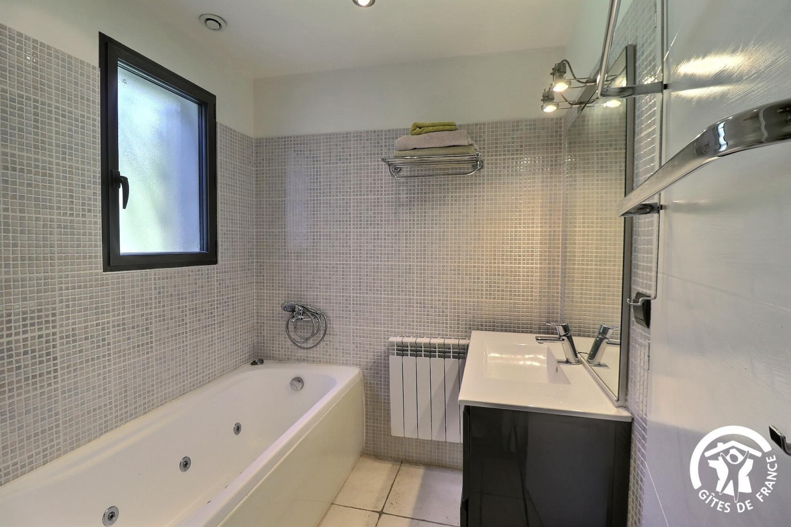 - Salle de bain avec douche type italienne avec rideau, baignoire balnéo, lave-linge, vasque avec rangements.