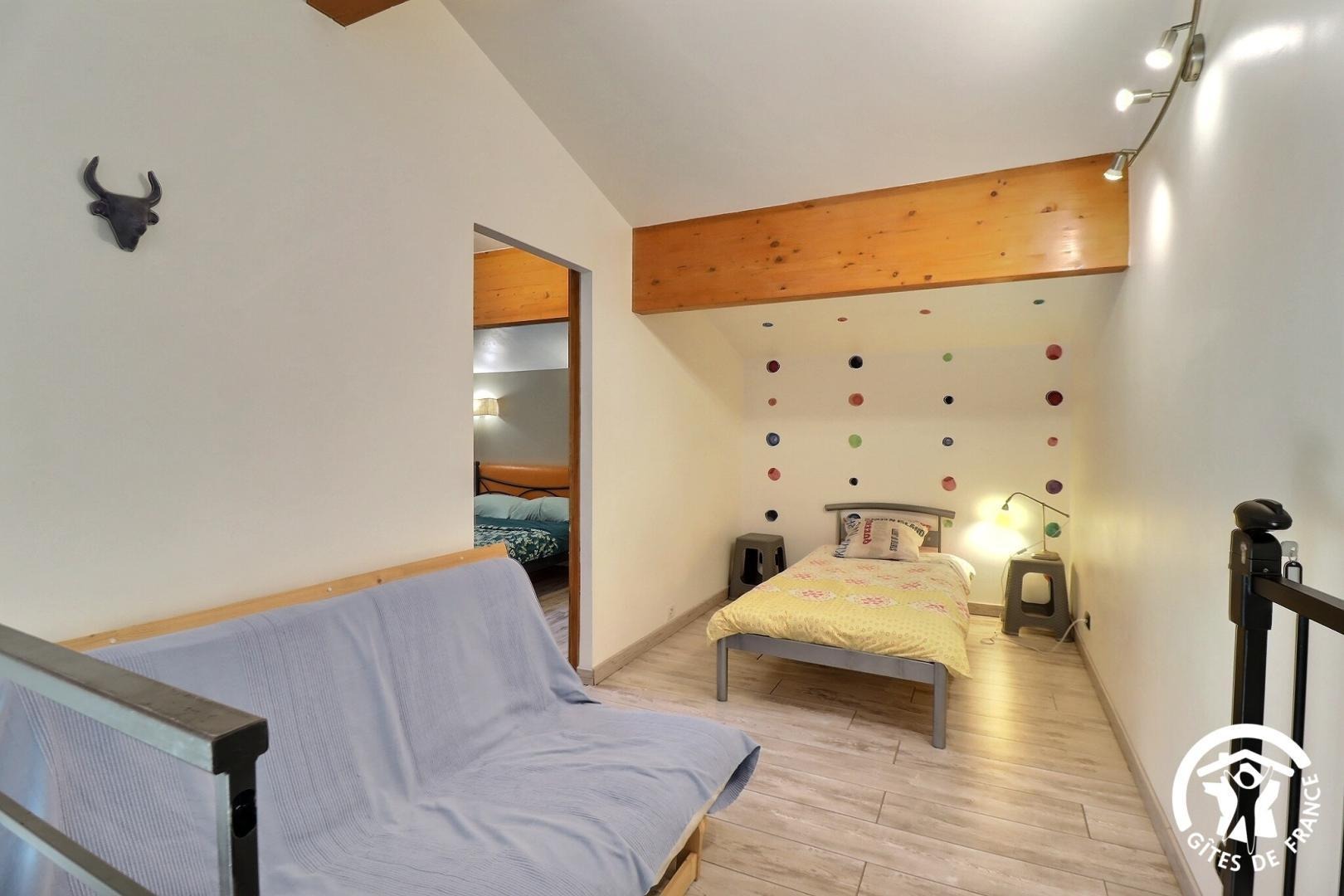 - Mezzanine avec lit simple et canapé convertible.