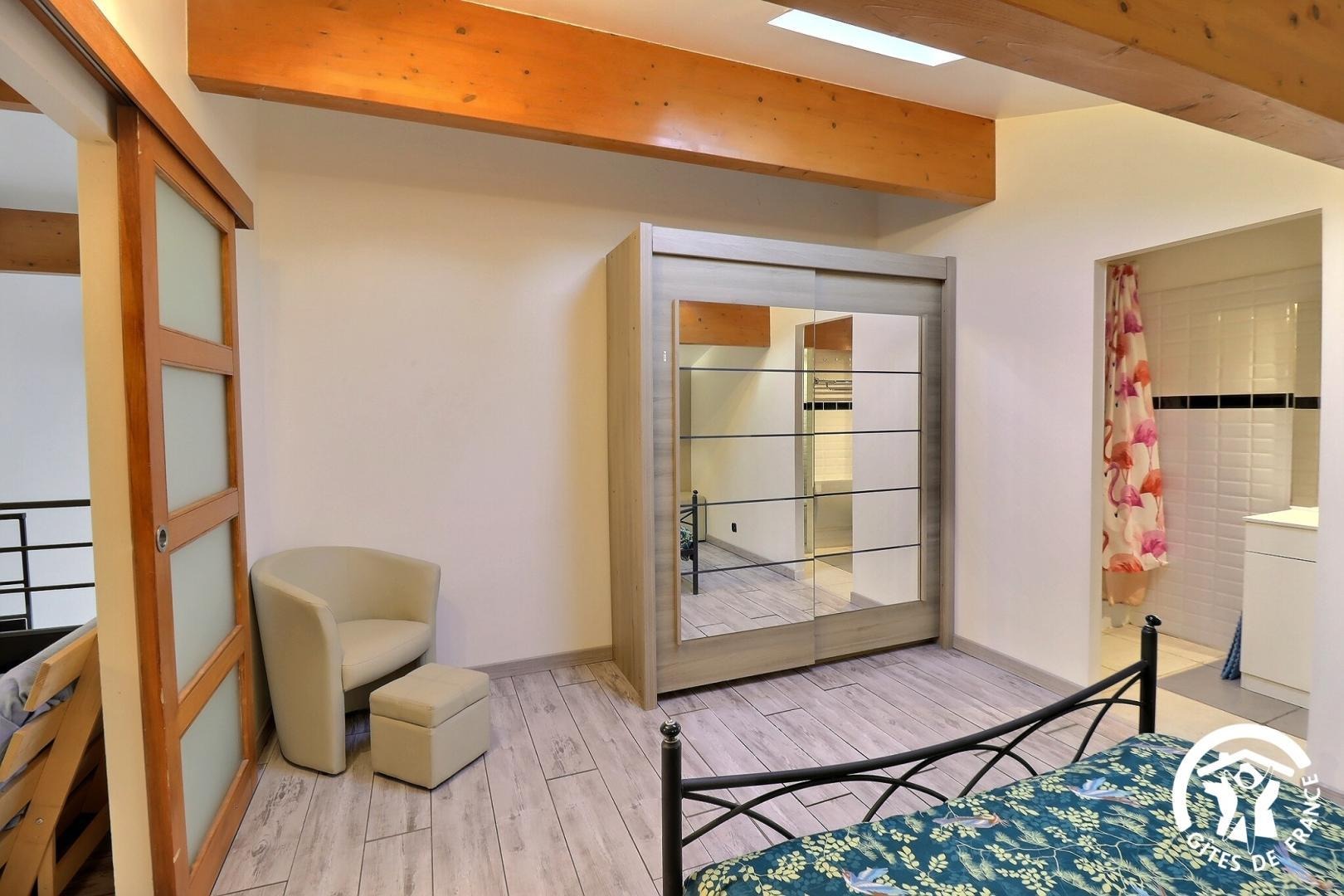- Chambre avec lit 140x190cm, fauteuil, armoire penderie.
