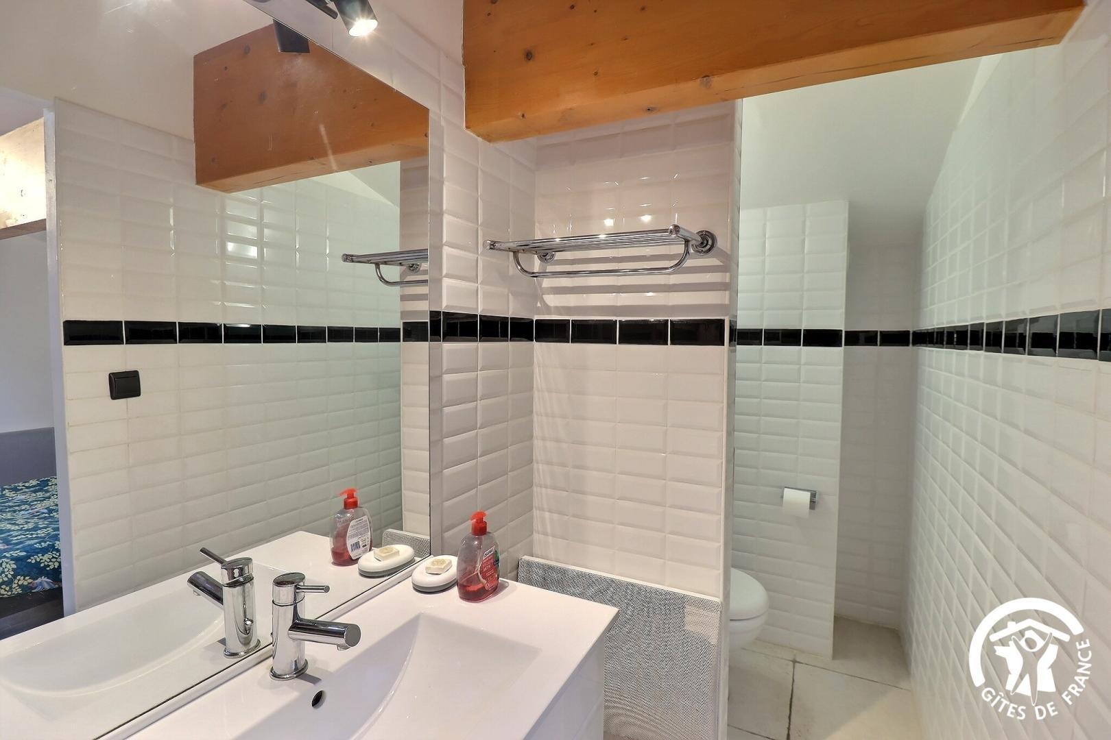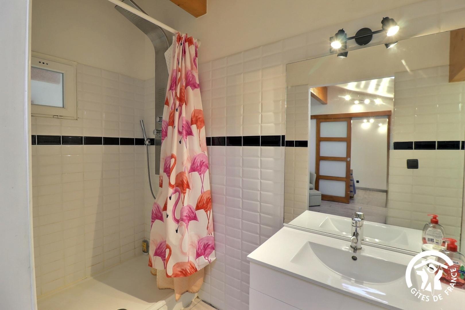 - Salle d'eau privative à la chambre de l'étage, douche avec rideau, vasque, porte serviettes et WC.
