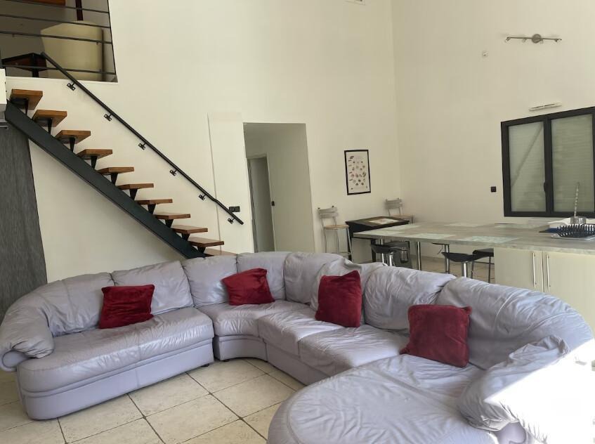 - Pièce de vie avec grande hauteur sous plafond : cuisine ouverte sur le séjour, équipée avec un grand îlot central avec espace repas 6 personnes, évier, réfrigérateur/congélateur, 4 feux gaz, hotte, four, micro-ondes, petit électroménager. Salon avec canapé d'angle, fauteuil, table basse, TV, penderie.