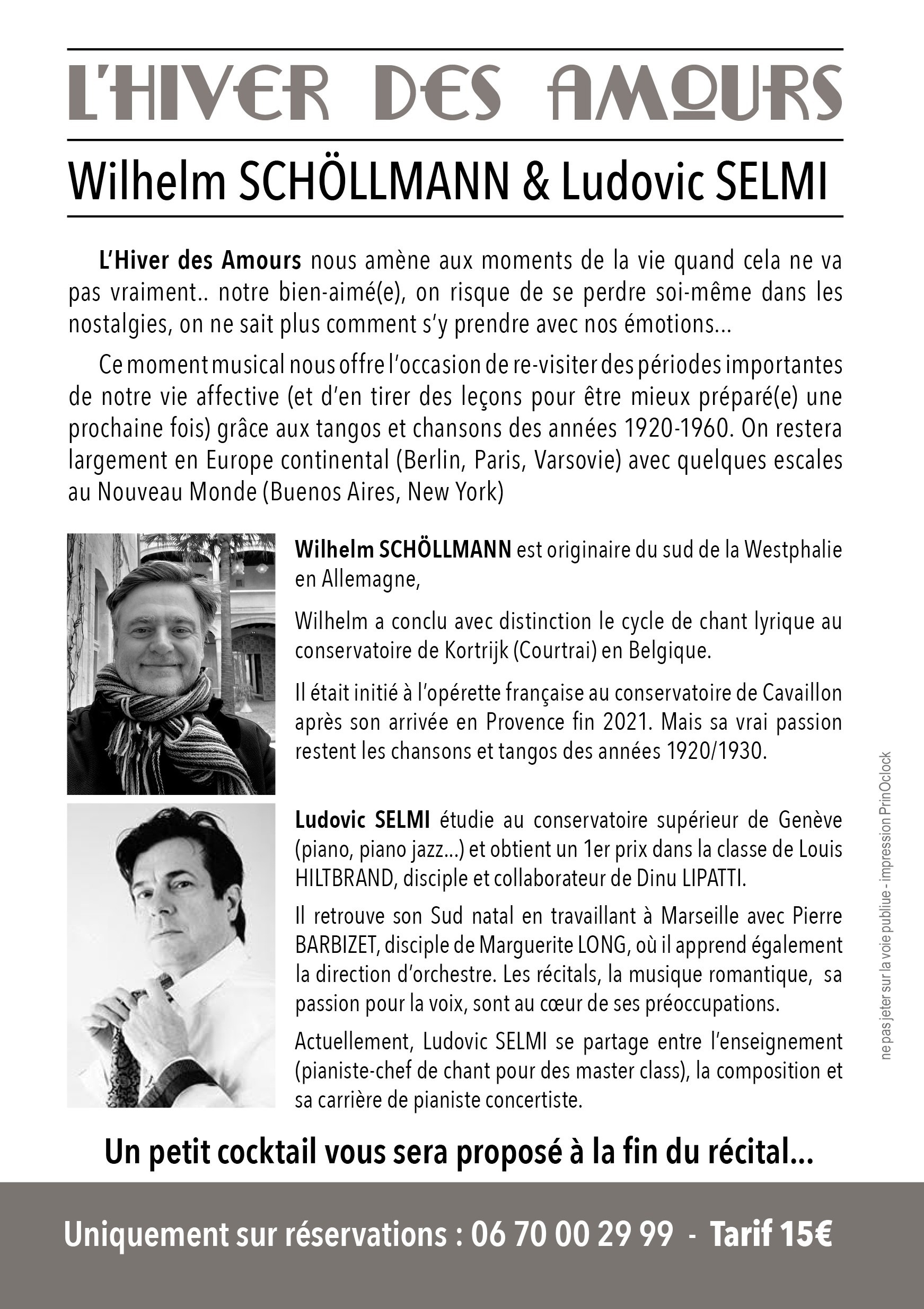 Ce moment musical nous offre l'occasion de re-visiter des périodes importantes de notre vie affective grâce aux tangos et aux chansons des années 1920 - 1960 ! Wilhem Schöllmann vous entraine dans le répertoire des chansons et des tangos des années 1920/1930 accompagné au piano de Ludovic Selmi, "le célèbre pianiste", pour cet évènement musical "L'Hiver des Amours" !